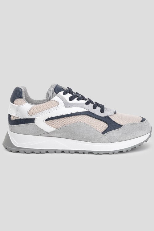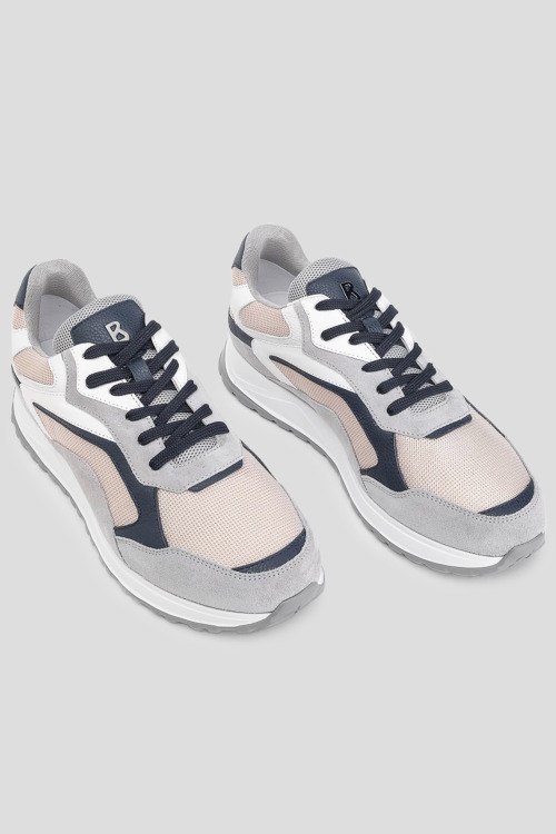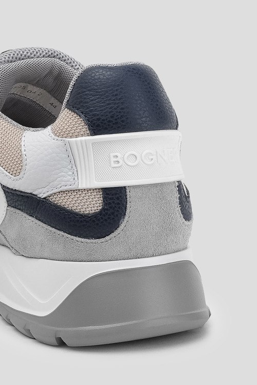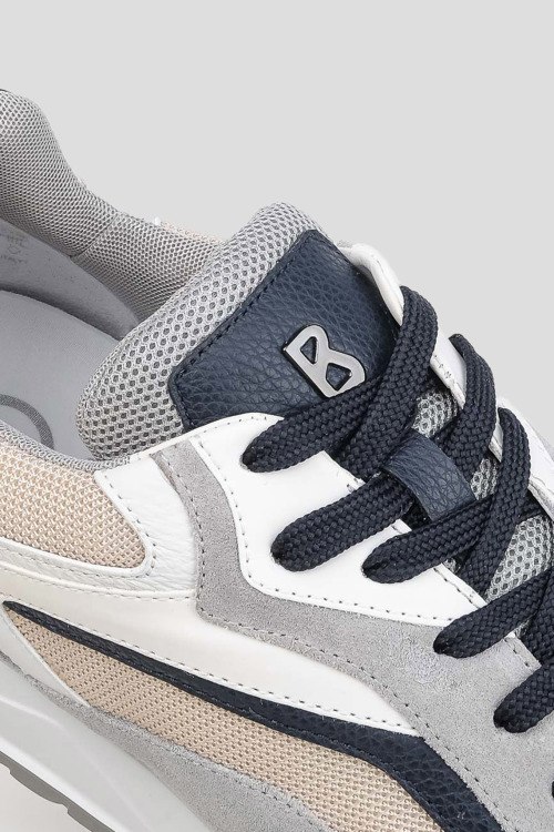 Детали: Мужские серо-бежевые кроссовки из замши и текстиля Michigan от Bogner (Богнер). Комбинация цветов и материалов, логотип сбоку и на пятке, классическая шнуровка, закругленный носок, белая подошва