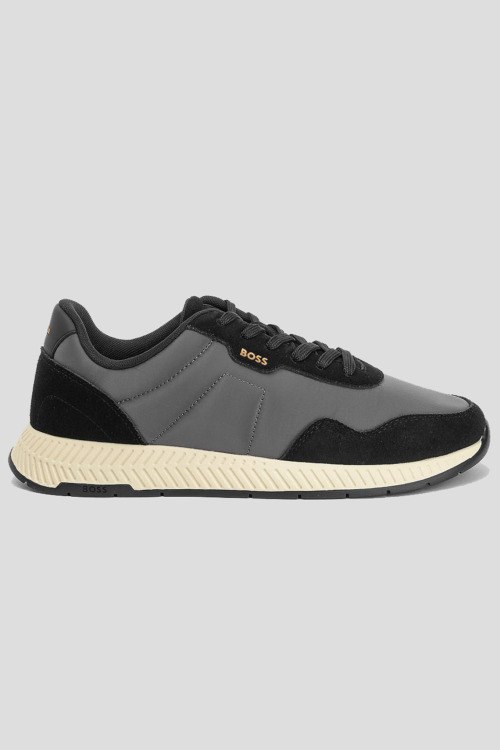 Детали: Мужские серые кроссовки Titanium из текстиля и замши от Hugo Boss (Хуго Босс). Комбинация цветов и материалов, закругленный носок, спереди классическая шнуровка, логотип бренда, рельефная подошва