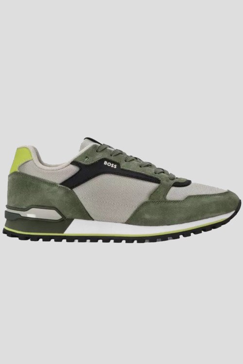 Детали: Мужские серо-зеленые кроссовки из замши и текстиля Parkour от Hugo Boss (Хуго Босс). Комбинация материалов, логотип сбоку и на язычке, классическая шнуровка, закругленный носок, ребристая подошва