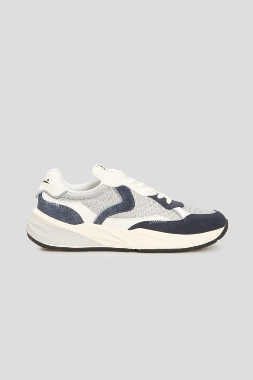 Детали: Мужские серо-синие кроссовки из замши и текстиля от Voile Blanche (Вуаль Бланш). Комбинация цветов и материалов, классическая шнуровка, логотип на язычке, закругленный носок, белая подошва. Высота подошвы: 4,5 см