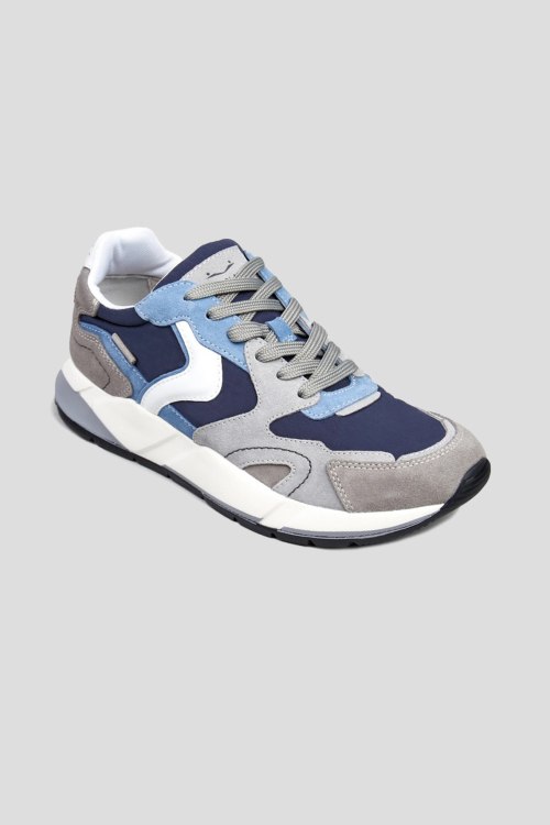 Детали: Мужские серо-синие кроссовки из замши и текстиля от Voile Blanche (Вуаль Бланш). Комбинация цветов и материалов, логотип на язычке, классическая шнуровка, закругленный носок