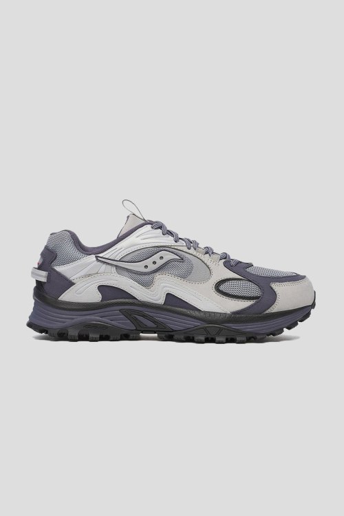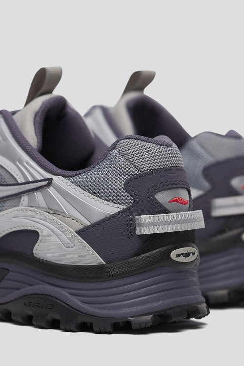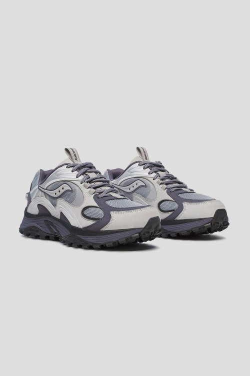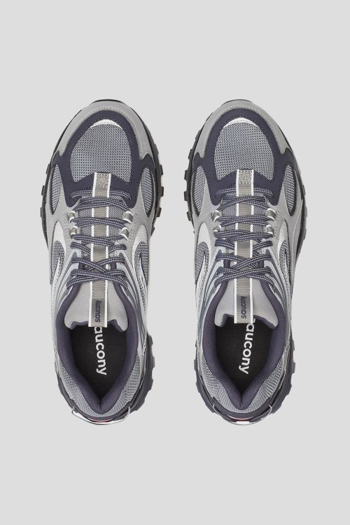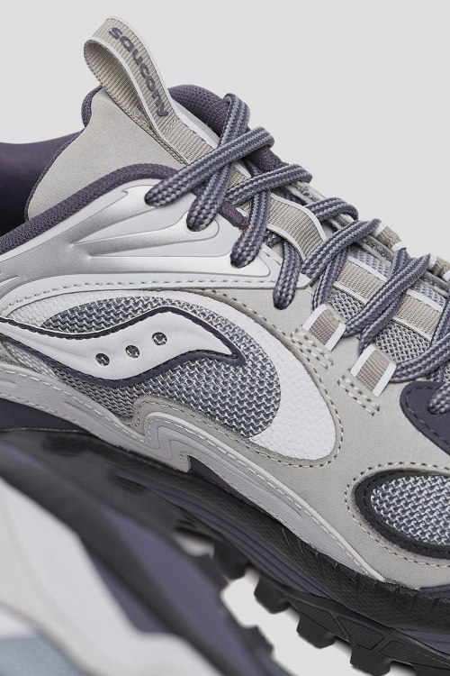 Детали: Мужские серые кроссовки из замши и текстиля Grid Aura X от Saucony (Сайкони). Комбинация цветов и материалов, логотип сбоку и на язычке, классическая шнуровка, закругленный носок, резиновая подошва