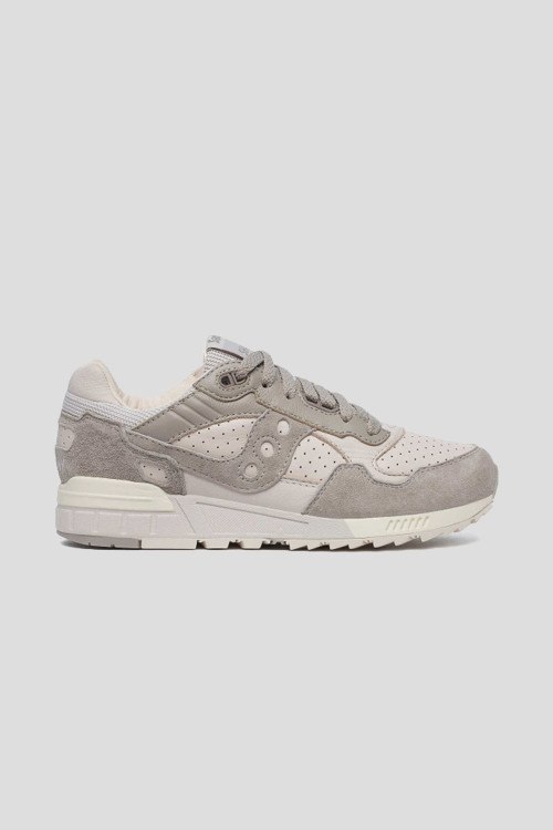 Мужские серые кроссовки Shadow 5000 из текстиля и замши от Saucony (Сайкони). Комбинация материалов и цветов, закругленный носок, спереди шнуровка, патч-лого, рельефная подошва
