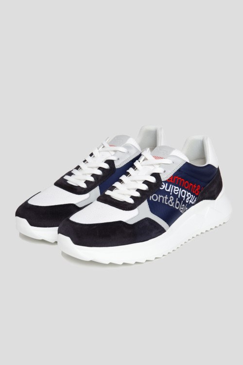 Детали: Мужские сине-белые кроссовки из натуральной замши и текстиля от Harmont & Blaine (Хармонт энд Блейн). Комбинированный дизайн, спереди классическая шнуровка, мягкий язычок, уплотненный задник, резиновая подошва белого цвета, съемная анатомическая стелька, вышитый логотип бренда