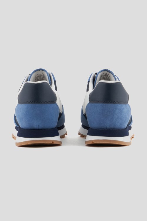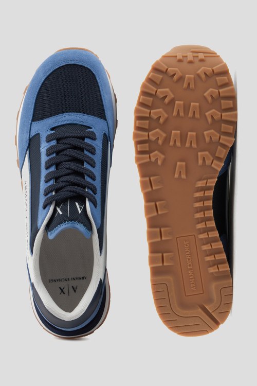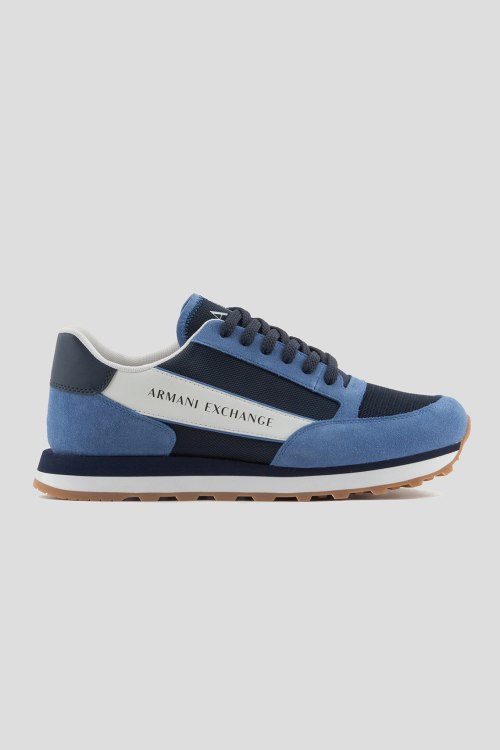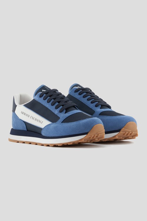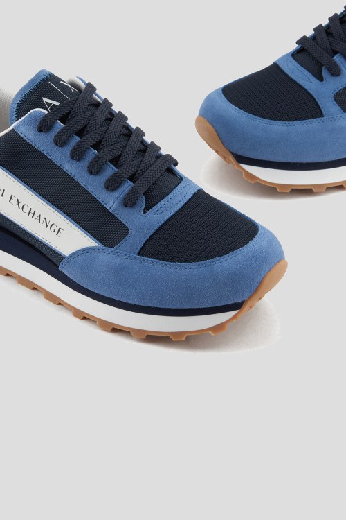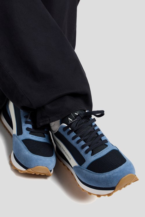 Детали: Мужские сине-голубые кроссовки из замши и текстиля от Armani Exchange (Армани Эксчендж). Комбинация цветов и материалов, логотип сбоку и на язычке, классическая шнуровка, закругленный носок, рельефная резиновая подошва