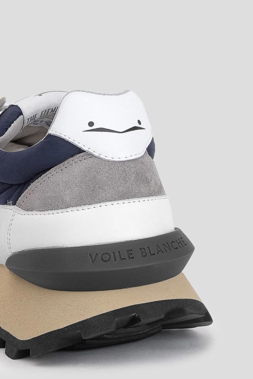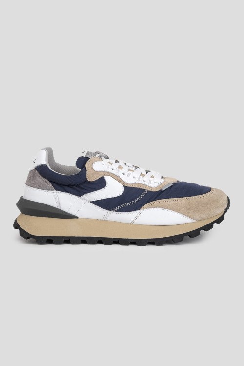 Детали: Мужские сине-бежевые кроссовки из замши и нейлона от Voile Blanche (Вуаль Бланш). Комбинация цветов и материалов, кожаные вставки, логотип на язычке, классическая шнуровка, закругленный носок, ребристая подошва