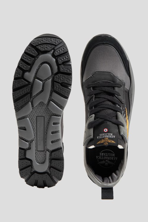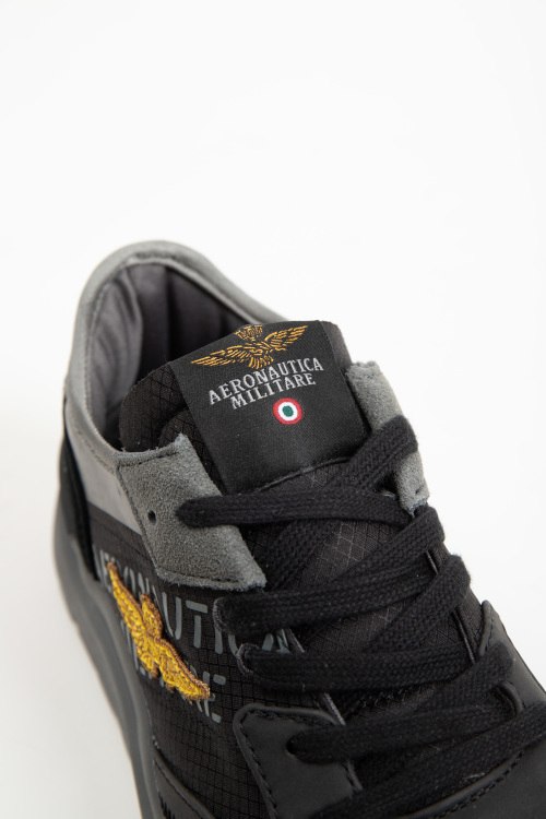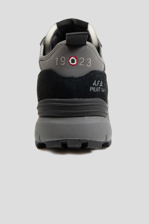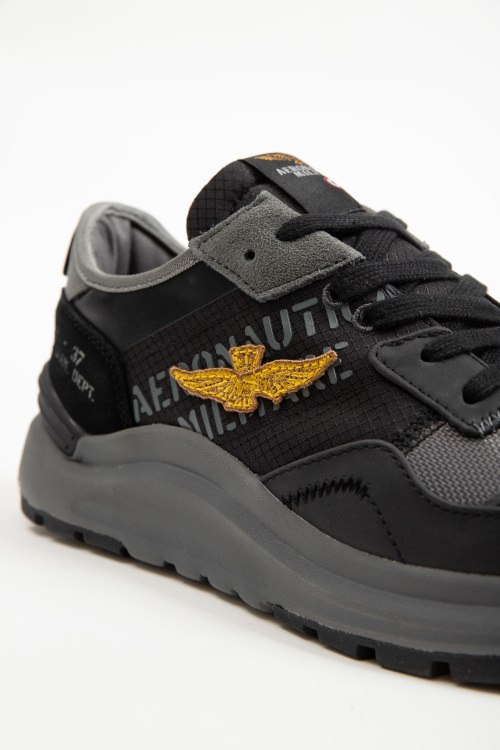 Детали: Мужские темно-серые кроссовки из текстиля и натуральной замши от Aeronautica Militare (Аэронавтика Милитари). Дизайн в виде комбинации цветов и материалов, закругленный носок, спереди классическая шнуровка, брендированные нашивки, патч-лого, петля для подтягивания, рельефная резиновая подошва