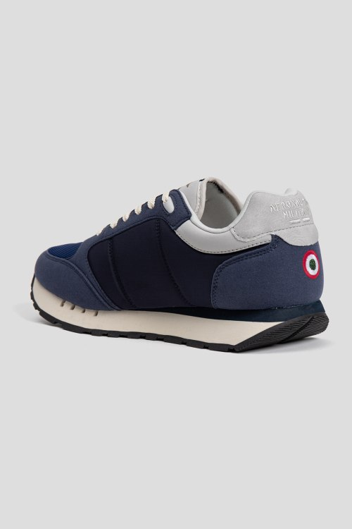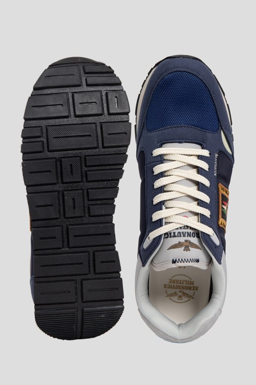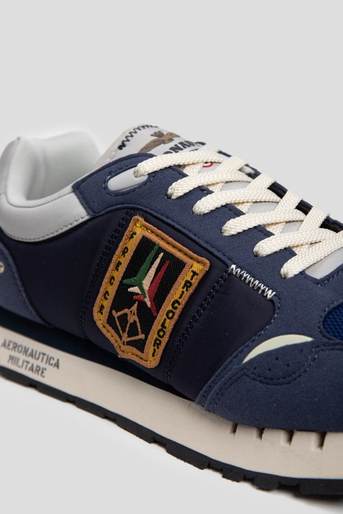 Детали: Мужские темно-синие кроссовки из экозамши и текстиля от Aeronautica Militare (Аэронавтика Милитари). Закругленный носок, спереди классическая шнуровка. патч-лого, вышитый логотип, рельефная подошва