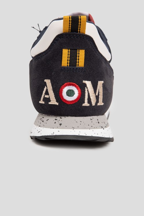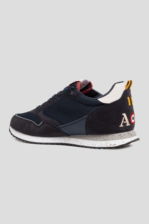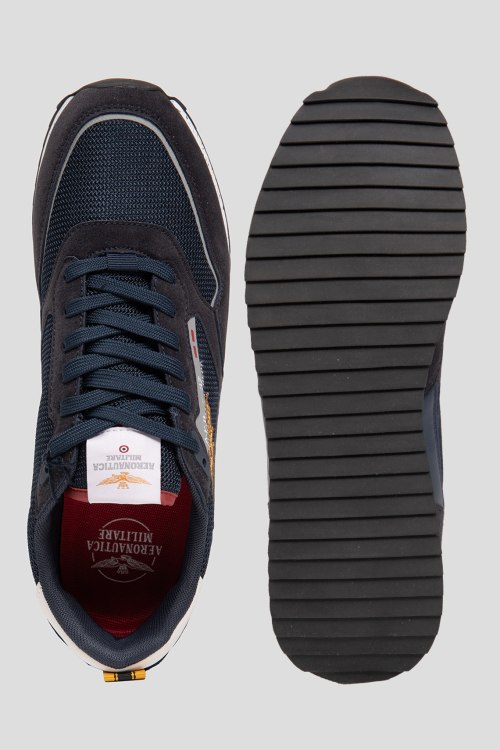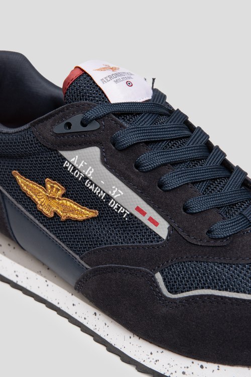 Детали: Мужские темно-синие кроссовки из текстиля и экозамши от Aeronautica Militare (Аэронавтика Милитари). Комбинация цветов и материалов, логотип сбоку и на язычке, классическая шнуровка, петля для подтягивания сзади, закругленный носок