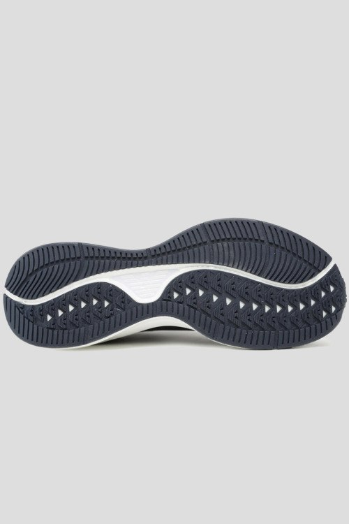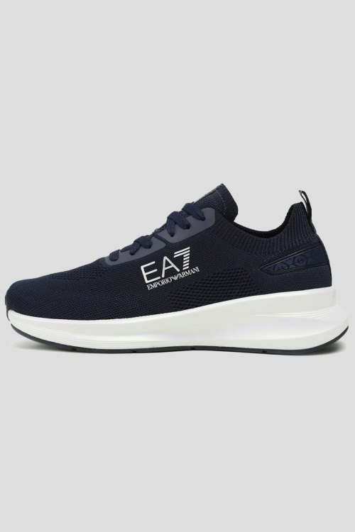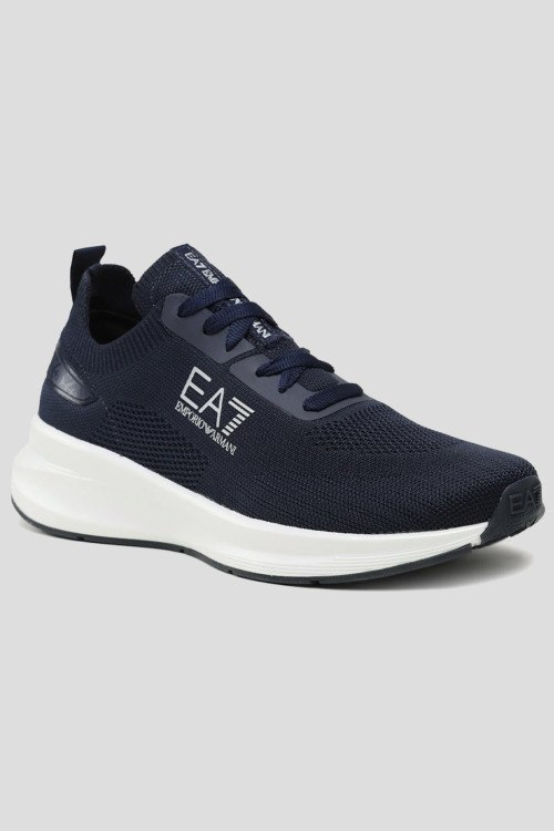 Мужские темно-синие кроссовки из текстиля от EA7 Emporio Armani (ЕА7 Эмпорио Армани). Закругленный носок, спереди шнуровка, петля для подтягивания, патч-лого, резиновая подошва белого цвета
