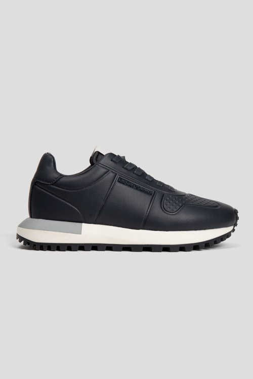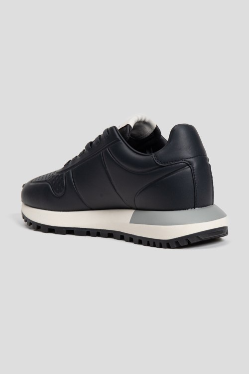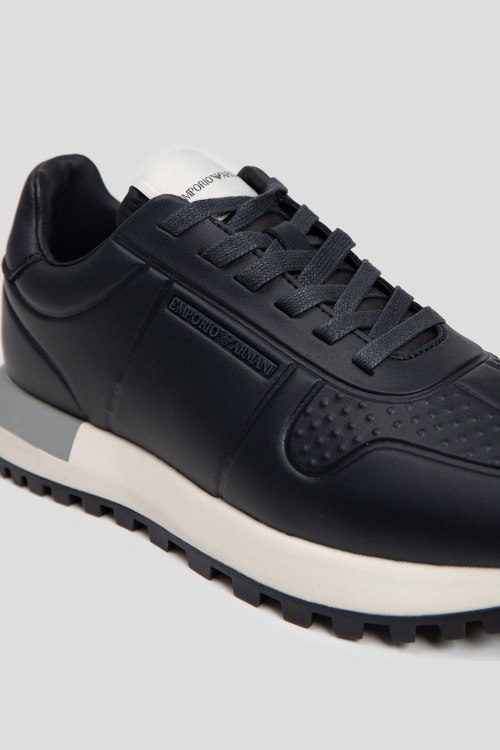 Детали: Мужские темно-синие кроссовки из натуральной кожи от Armani (Армани). Закругленный носок, спереди классическая шнуровка, патч-лого, рельефная подошва
