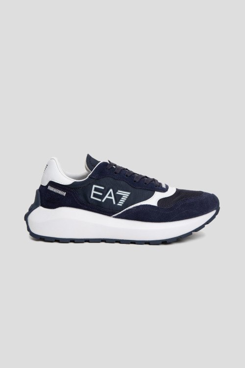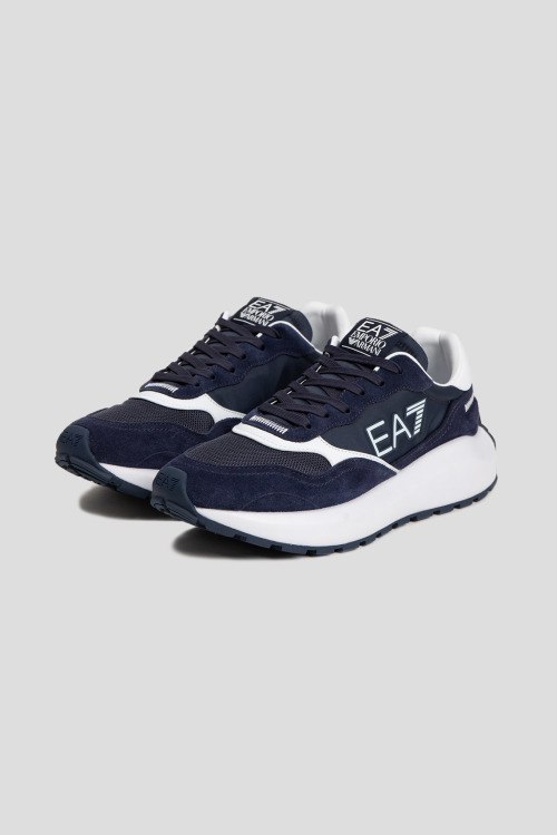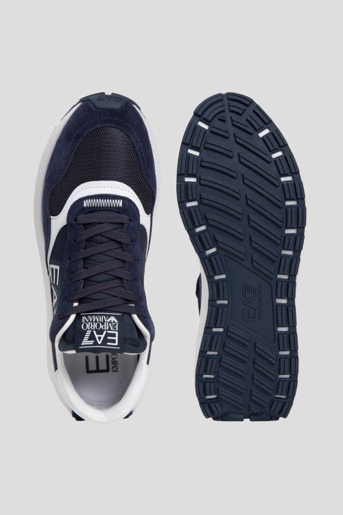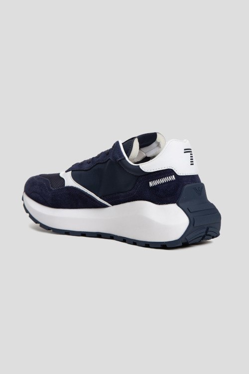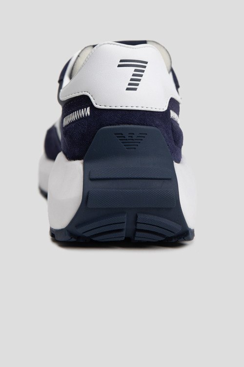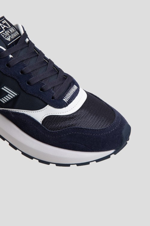 Детали: Мужские темно-синие кроссовки из замши и текстиля от EA7 Emporio Armani (ЕА7 Эмпорио Армани). Комбинация материалов, логотип сбоку и на язычке, классическая шнуровка, закругленный носок, белая подошва