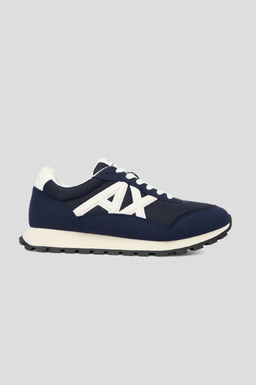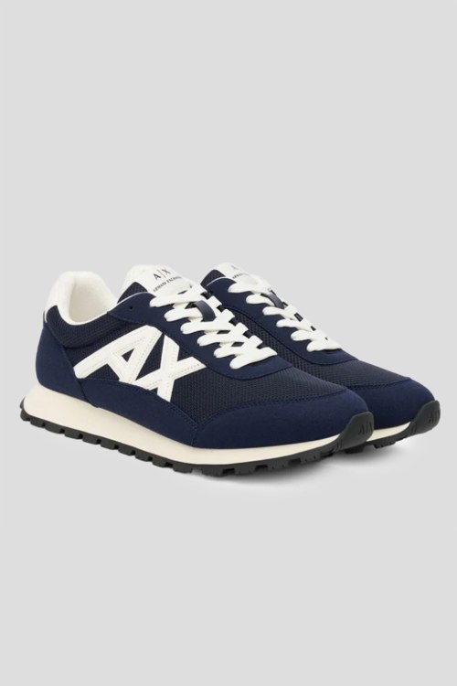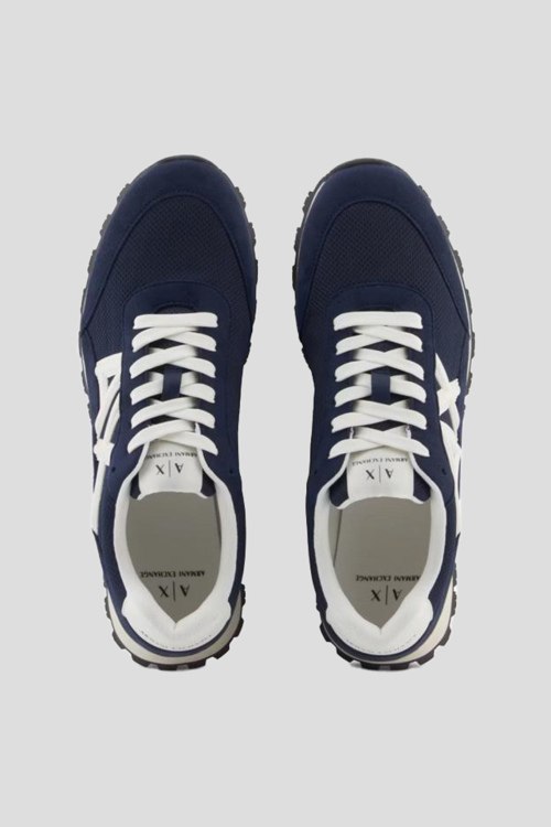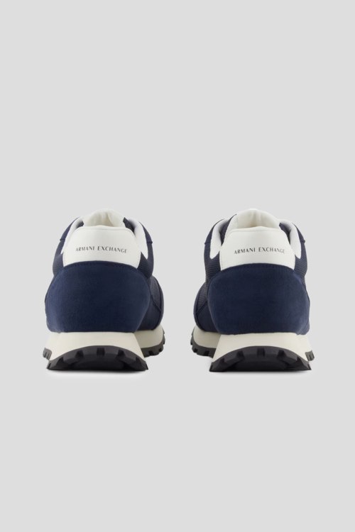 Детали: Мужские темно-синие кроссовки из замши и текстиля от Armani Exchange (Армани Эксчендж). Комбинация материалов, логотип сбоку и на язычке, классическая шнуровка, закругленный носок, рельефная подошва