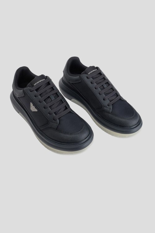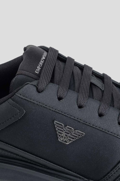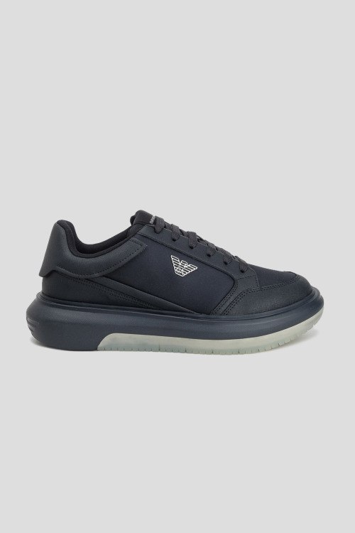 Детали: Мужские темно-синие кроссовки из текстиля и экокожи от Emporio Armani (Эмпорио Армани). Комбинация материалов, логотип сбоку и на язычке, классическая шнуровка, закругленный носок