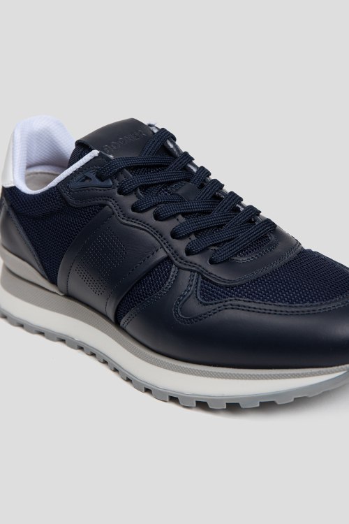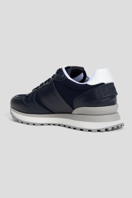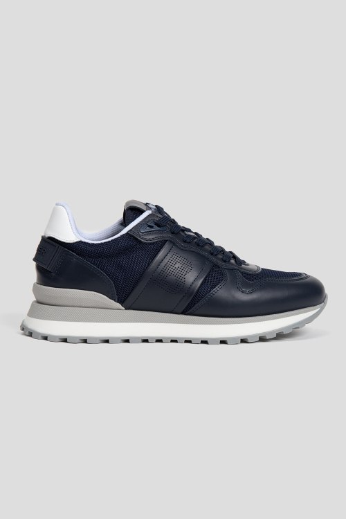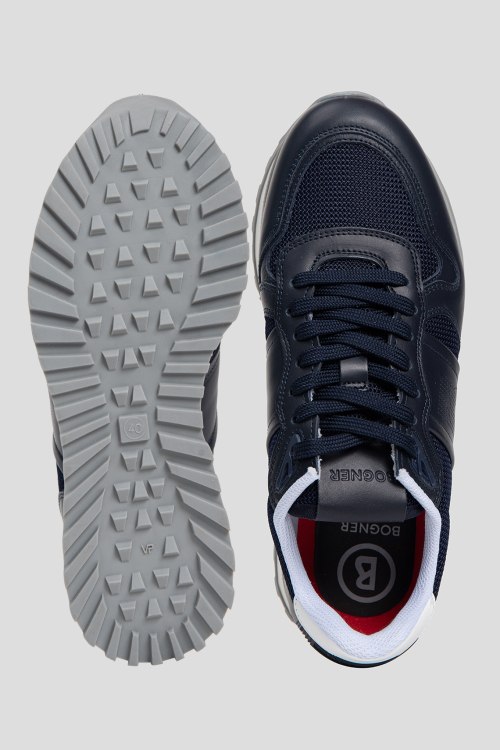 Детали: Мужские темно-синие кроссовки из кожи и текстиля Newport от Bogner (Богнер). Комбинация материалов, логотип сбоку, на язычке и на пятке, классическая шнуровка, закругленный носок, ребристая подошва