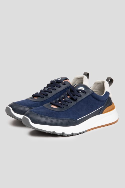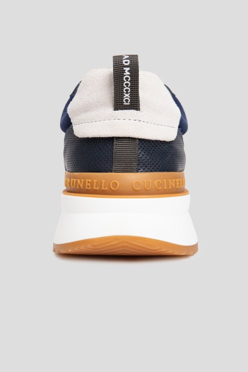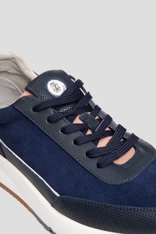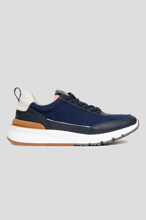 Детали: Мужские темно-синие кроссовки из замши и кожи от Brunello Cucinelli (Брунелло Кучинелли). Комбинация цветов и материалов, логотип на язычке и на пятке, классическая шнуровка, петля для подтягивания сзади, закругленный носок. Обувь категории outlet, коробка может быть повреждена