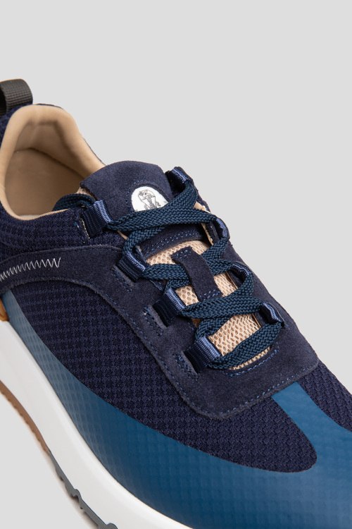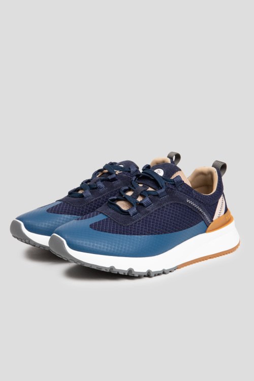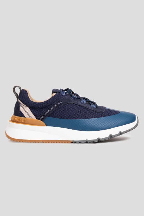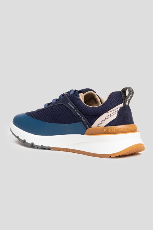 Детали: Мужские темно-синие текстильные кроссовки от Brunello Cucinelli (Брунелло Кучинелли). Комбинация цветов и материалов, логотип на язычке и на пятке, классическая шнуровка, петля для подтягивания сзади, закругленный носок. Обувь категории outlet, коробка может быть повреждена