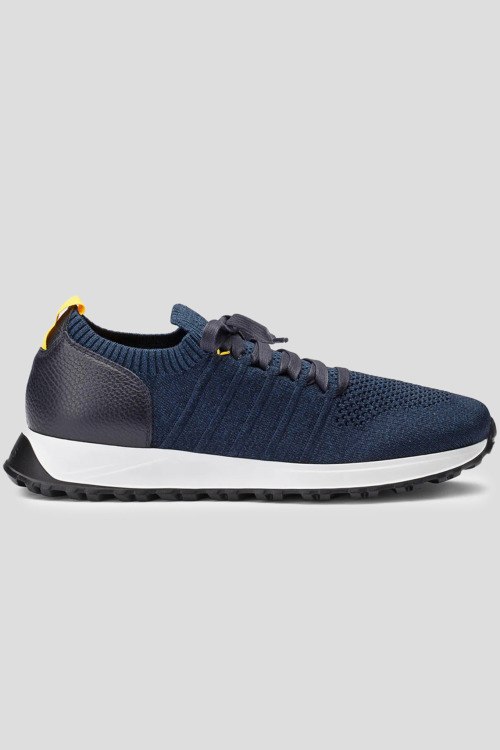 Детали: Мужские темно-синие кроссовки и текстиля от Doucal's (Дукалс). Закругленный носок, кожаная вставка на заднике, петля для подтягивания, спереди классическая шнуровка, рельефная подошва