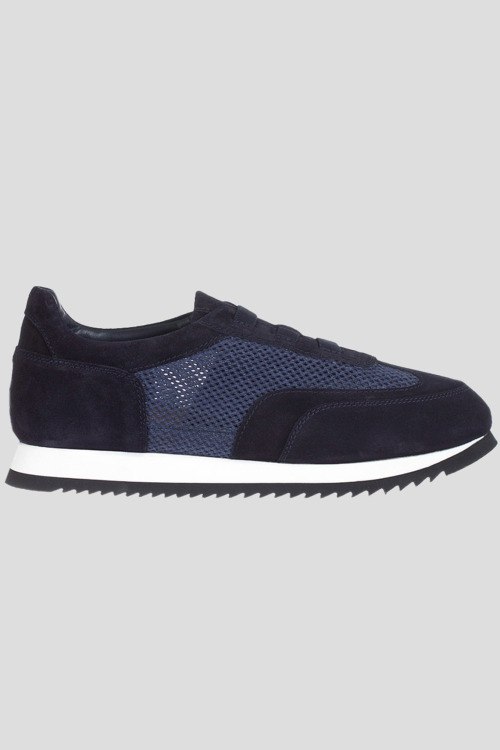 Детали: Мужские темно-синие кроссовки из замши и текстиля от Doucal's (Дукалс). Комбинация материалов, тиснение логотипа на язычке, эластичные резинки вместо шнурков, закругленный носок, ребристая подошва