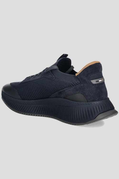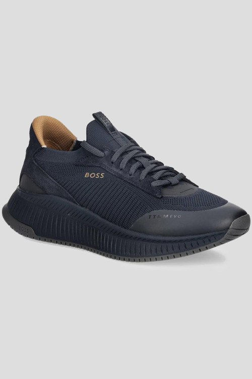 Детали: Мужские темно-синие кроссовки из текстиля от Hugo Boss (Хуго Босс). Комбинация материалов, спереди шнурвока, рельефная подошва, патч-лого