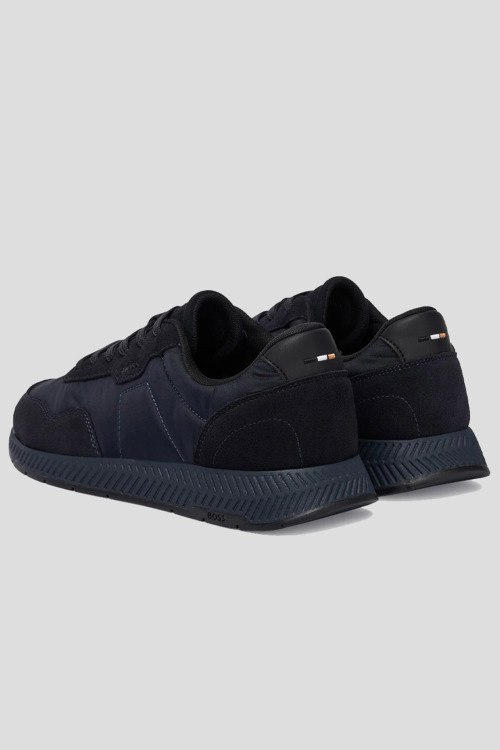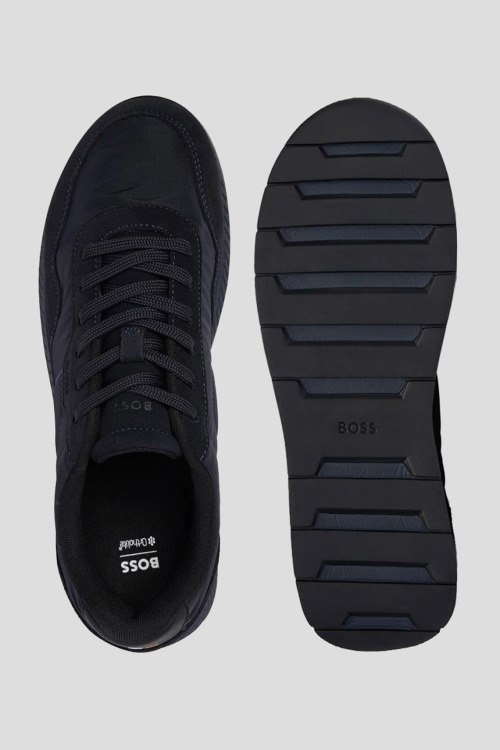 Детали: Мужские темно-синие кроссовки из полиэстера от Hugo Boss (Хуго Босс). ЗАкругленный носок, комбинированный дизайн, спереди классическая шнуровка, рельефная подошва, логотип бренда