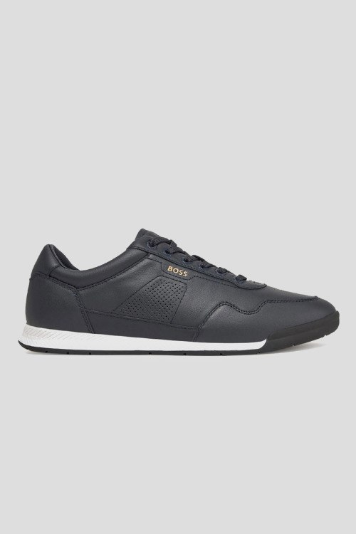Детали: Мужские темно-синие кожаные кроссовки Titanium от Hugo Boss (Хуго Босс). Модель из гладкой кожи, логотип сбоку и на язычке, классическая шнуровка, закругленный носок, белая подошва