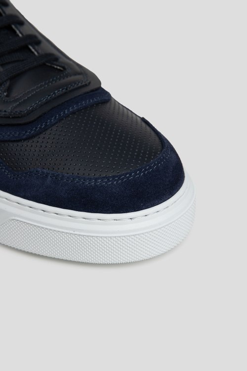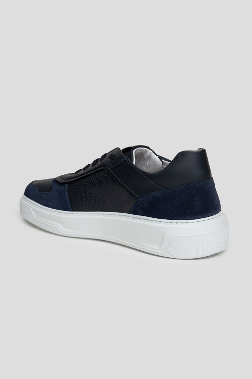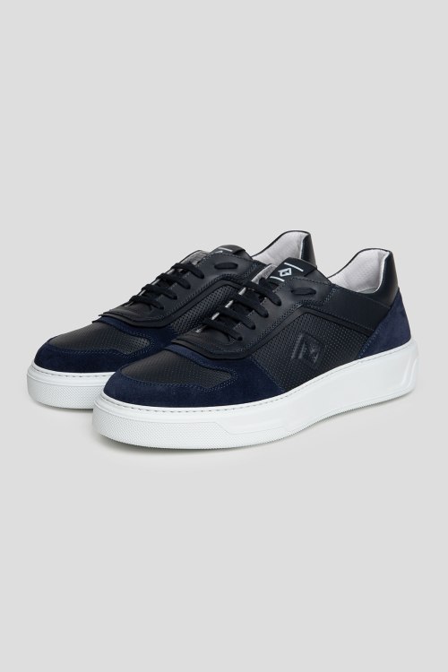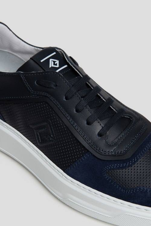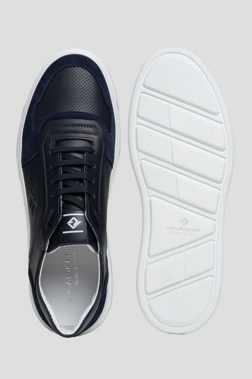 Детали: Мужские темно-синие кеды из натуральной кожи от Luca Guerrini (Лука Гуерини). Закругленный носок, дизайн с перфорацией, спереди классическая шнуровка, патч-лого на язычке, кожаная стелька, резиновая подошва белого цвета