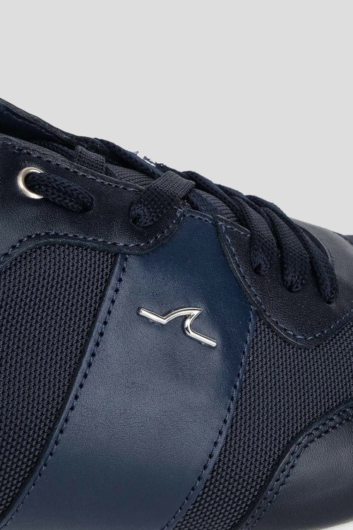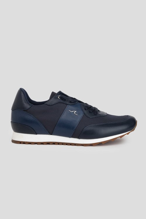 Мужские темно-синие кроссовки из кожи и текстиля от Paul & Shark (Пол энд Шарк). Комбинация материалов, логотип сбоку, классическая шнуровка, закругленный носок, белая подошва