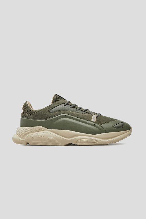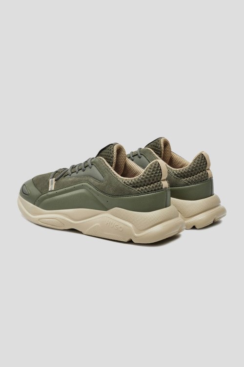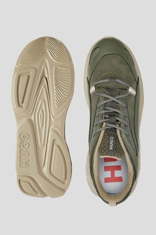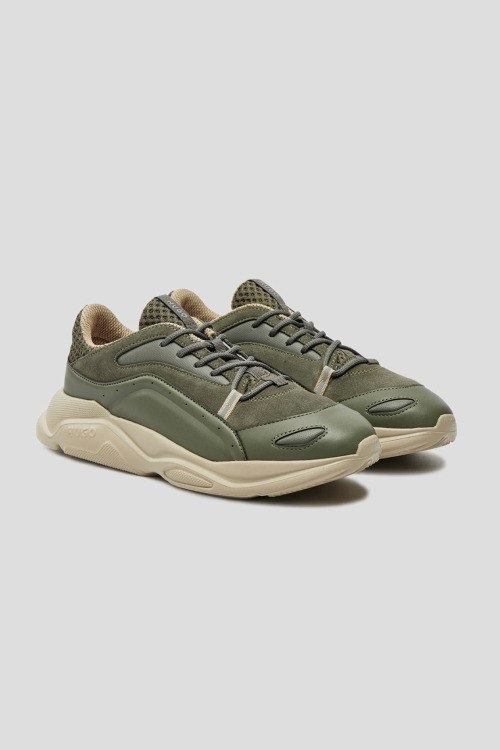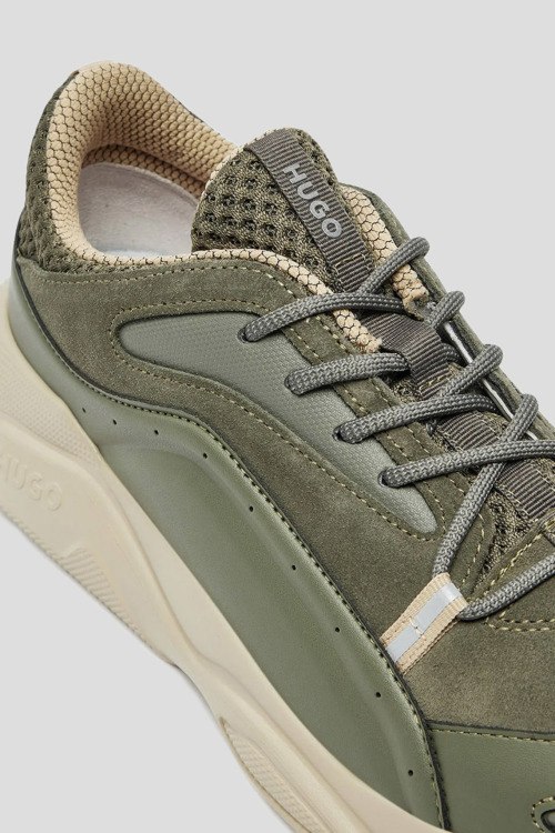 Детали: Мужские зеленые кроссовки Leon Runn из полиэстера и замши от Hugo by Hugo Boss (Хуго бай Хуго Босс). Закругленный носок, комбинированный дизайн, спереди шнуровка, патч-лого, массивная подошва