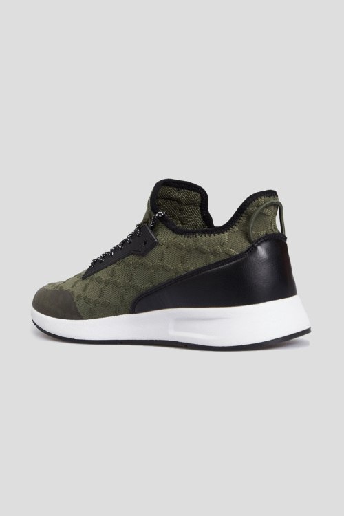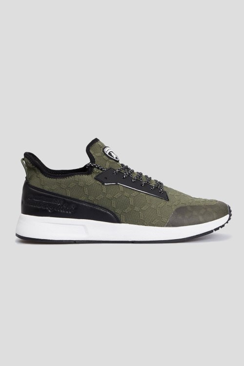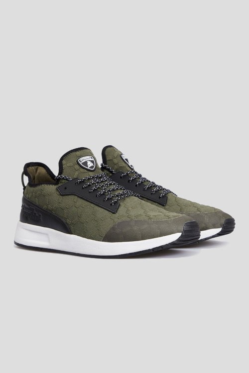 Мужские зеленые кроссовки из полиэстера от Automobili Lamborghini (Автомобили Ламборгини). Закругленный носок, кожаная вставка с тиснением логотипа бренда, патч-лого, спереди классическая шнуровка, петля для подтягивания