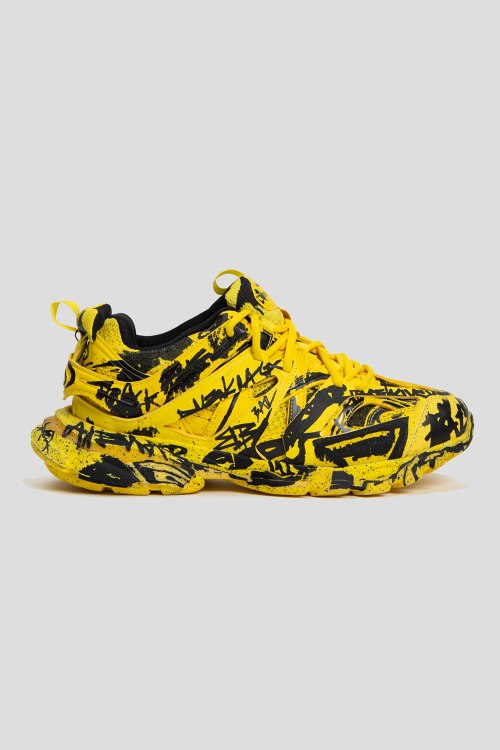 Детали: Мужские желтые кроссовки Track от Balenciaga (Баленсиага). Закругленный носок, шнуровка спереди, петля для подтягивания сзади, желтая резиновая подошва, комбинация цветов и материалов, принт с логотипом Balenciaga снаружи и тиснение Track на задней части каблука. Крутые и удобные, эти кроссовки станут отличным дополнением к весенне-летнему образу.