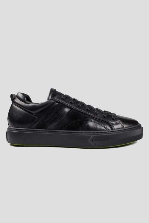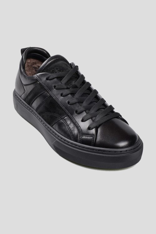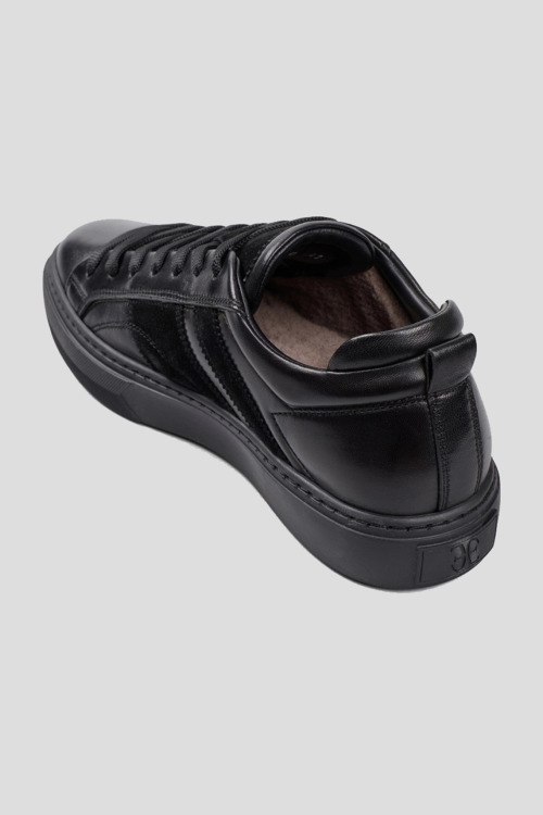 Детали: Мужские черные кожаные кеды на меху от Fabi (Фаби). Модель из гладкой кожи, замшевые вставки, логотип на язычке, классическая шнуровка, закругленный носок, внутри на меху
