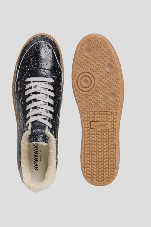 Детали: Мужские черные кеды из натуральной кожи от Hidnander (Хиднандер). Закругленный носок, спереди классическая шнуровка, модель утепленная мехом, резиновая подошва, тиснение с логотипом бренда на заднике