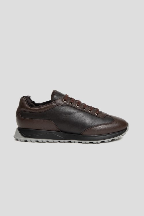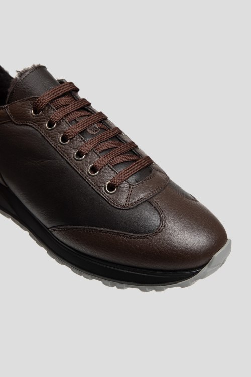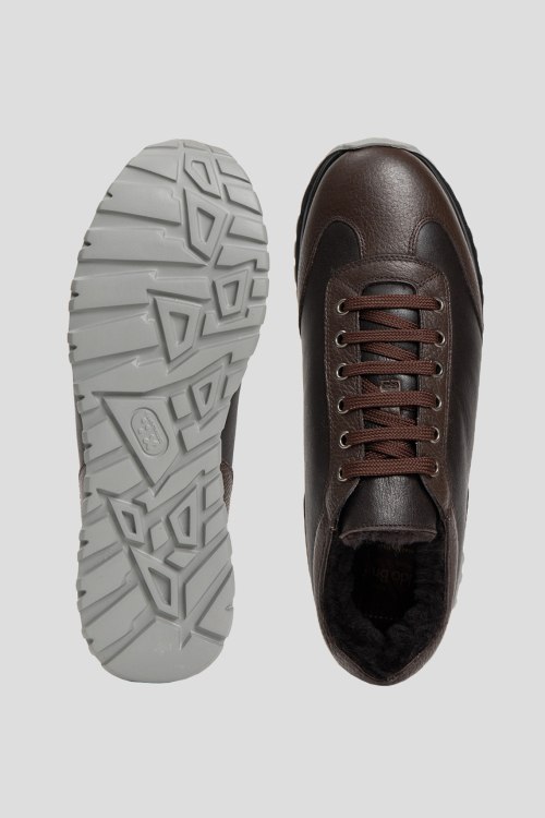 Детали: Мужские темно-коричневые кожаные кроссовки на меху от Aldo Brue (Алдо Бруе). Модель из гладкой кожи, классическая шнуровка, закругленный носок, внутри на меху