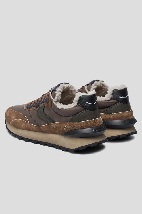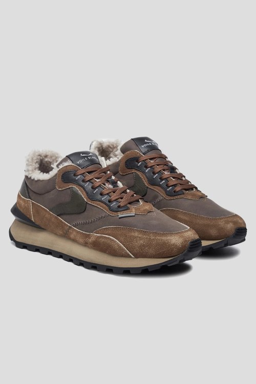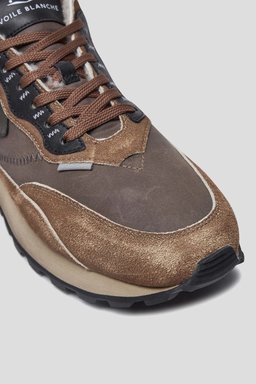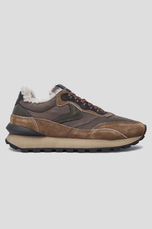 Детали: Мужские коричневые кроссовки Qwark Hype Fur из натуральной замши от Voile Blanche (Вуаль Бланш). Комбинация цветов и материалов, закругленный носок, спереди классическая шнуровка, патч-лого, модель утепленная экомехом, рельефная подошва