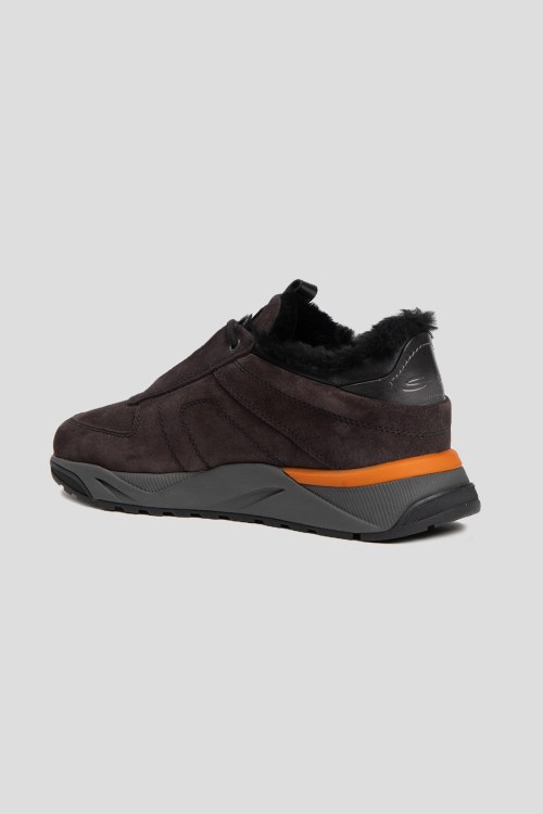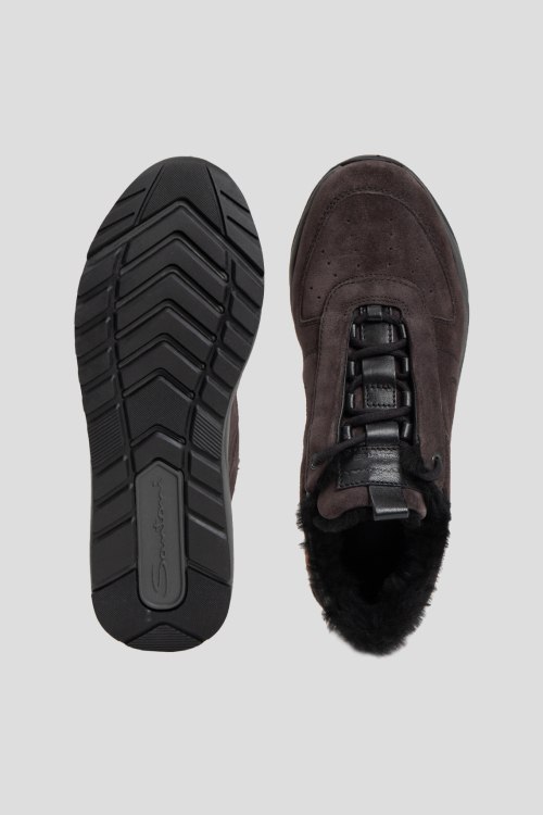 Детали: Мужские темно-коричневые замшевые кроссовки на меху от Santoni (Сантони). Логотип на пятке и на язычке, классическая шнуровка, закругленный носок, брендированная подошва, внутри на меху
