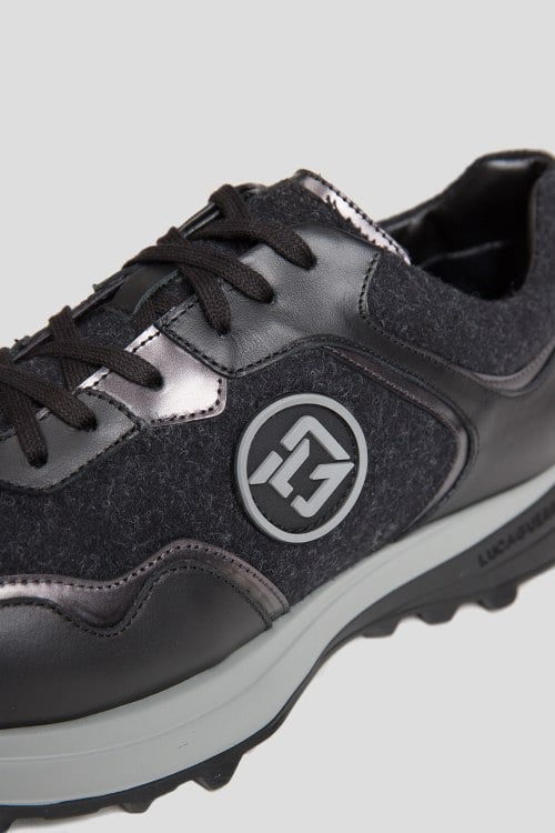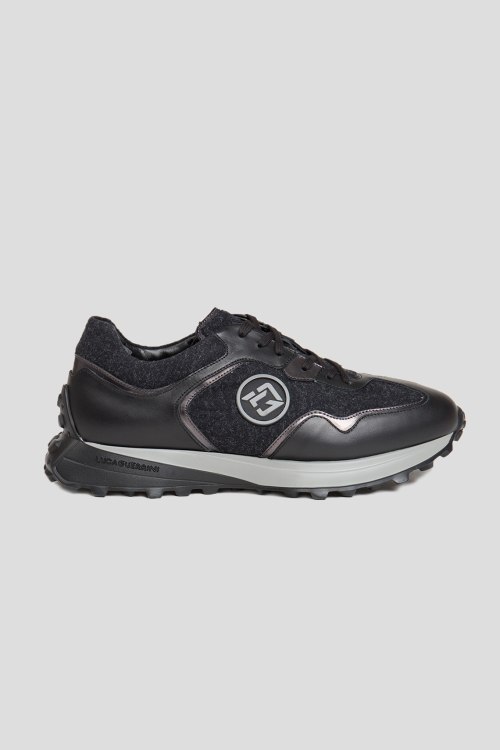 Детали: Мужские серо-черные кроссовки из кожи и текстиля на меху от Luca Guerrini (Лука Гуерини). Комбинация цветов и материалов, нашивка с логотипом сбоку, классическая шнуровка, закругленный носок, серо-черная подошва