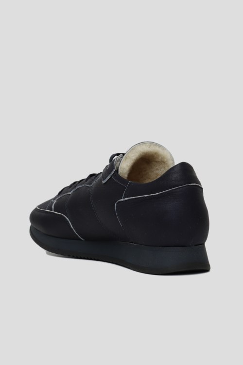 Детали: Мужские темно-синие кроссовки из кожи от Philippe Model (Филипп Модел). Закругленный носок, спереди классическая шнуровка утепленные натуральным мехом, патч-лого, резиновая подошва