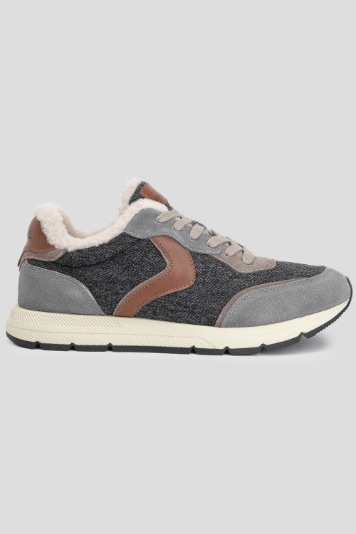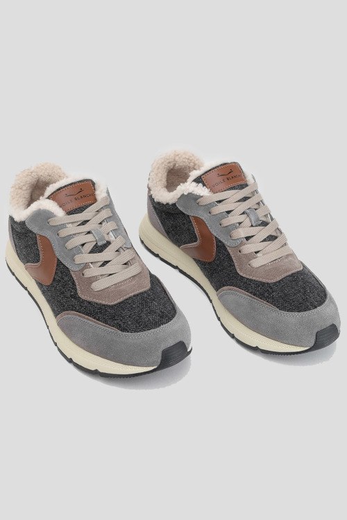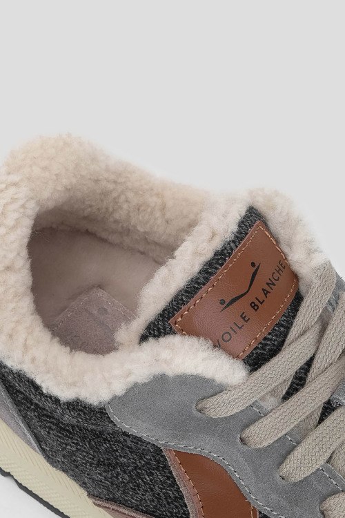 Детали: Мужские темно-серые кроссовки из замши и текстиля на меху от Voile Blanche (Вуаль Бланш). Комбинация цветов и материалов, логотип на язычке и на пятке, классическая шнуровка, закругленный носок, внутри на меху, светлая подошва