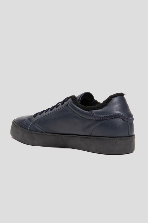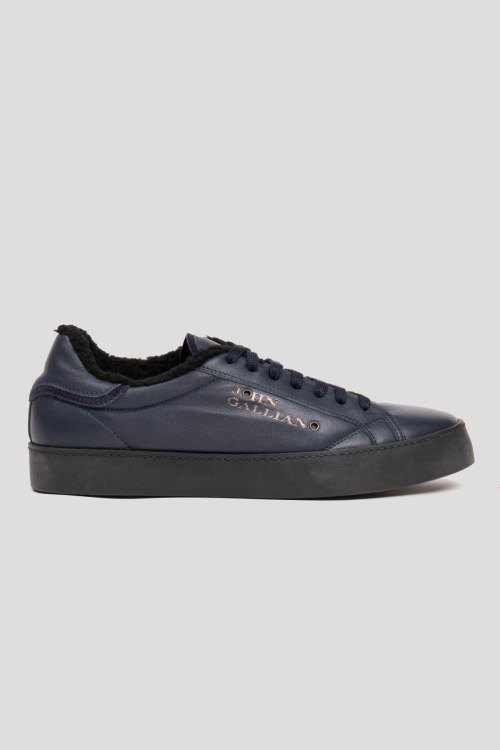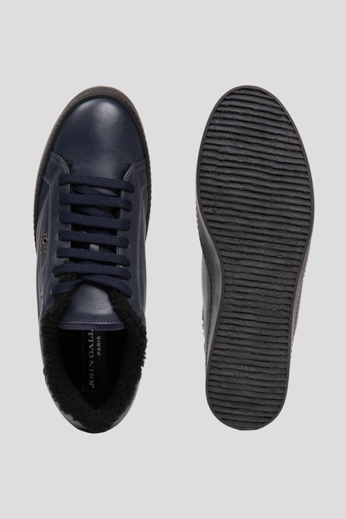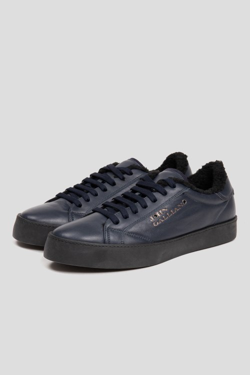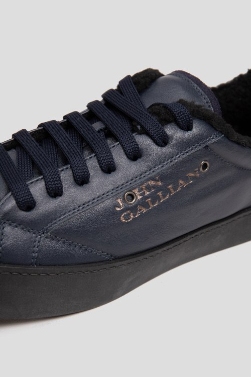 Детали: Мужские темно-синие кожаные кеды на меху от John Galliano (Джон Гальяно). Модель из гладкой кожи, логотип сбоку, классическая шнуровка, закругленный носок, черная подошва, внутри на меху