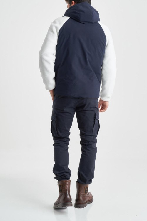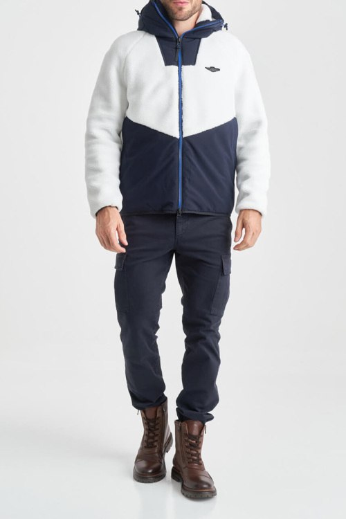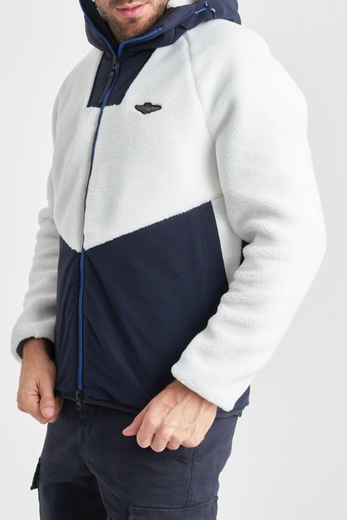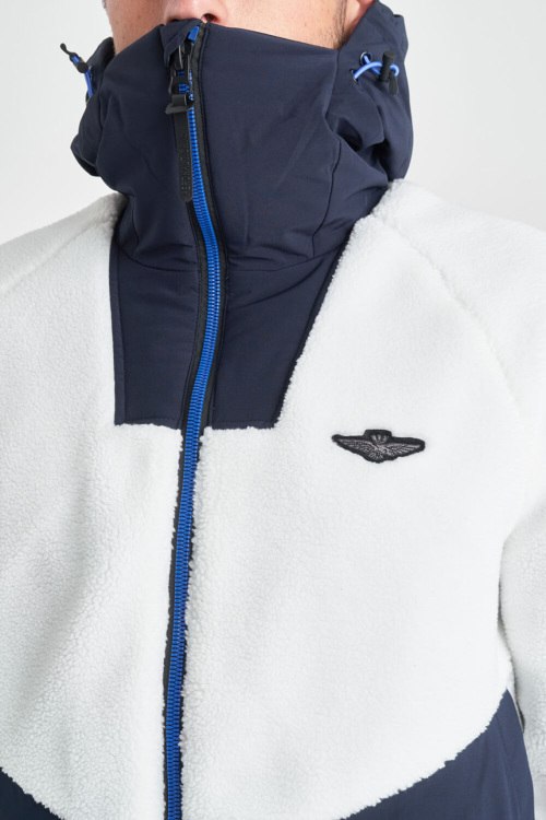 Детали: Мужская бело-синяя куртка от Aeronautica Militare (Аэронавтика Милитари). Дизайн колор-блок, вшитый капюшон, логотип на груди, боковые карманы, застежка-молния, классическая длина