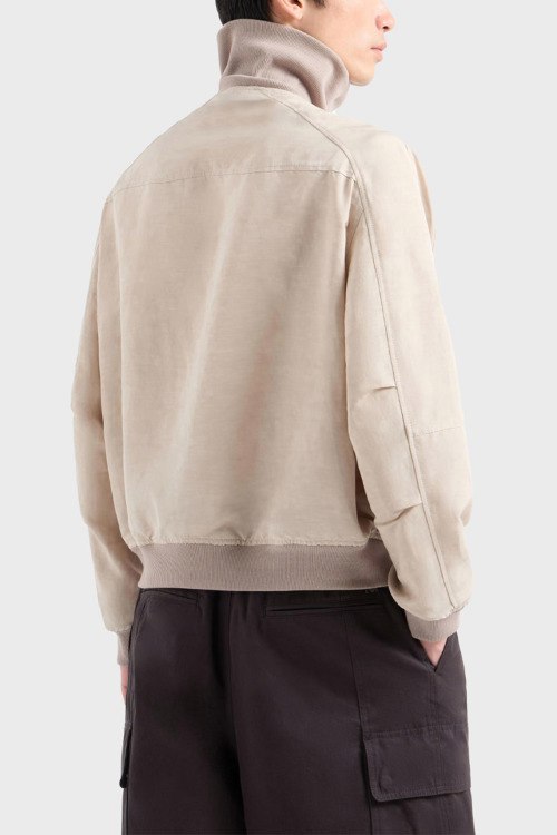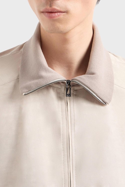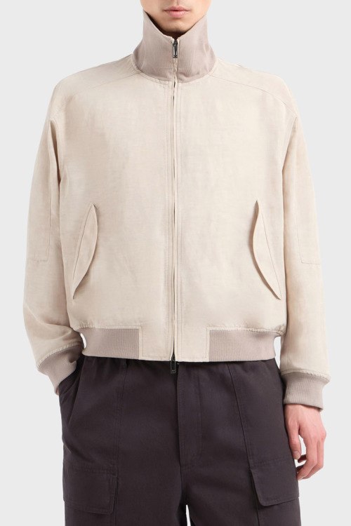 Детали: Мужская светло-бежевая куртка из вискозы и льна от Emporio Armani (Эмпорио Армани). Высокий воротник, боковые карманы, застежка-молния, классическая длина, трикотажные манжеты и нижний край