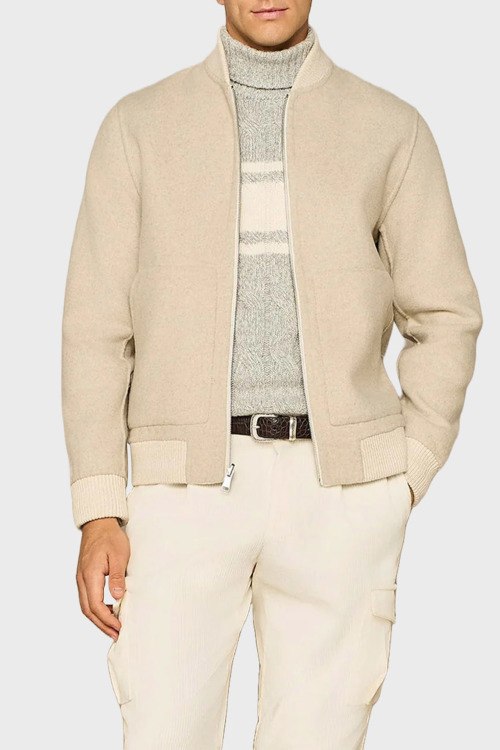 Детали: Мужской бежевый двухсторонний бомбер с примесью шерсти от Paul Taylor (Пол Тейлор). Воротник-стойка, боковые карманы, застежка-молния, классическая длина, трикотажные манжеты и нижний край