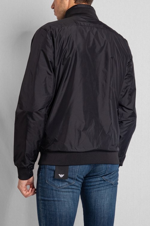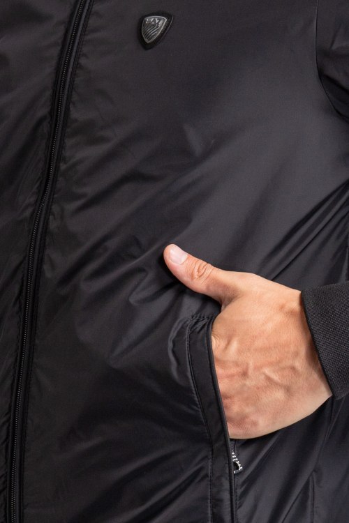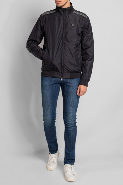 Мужска черная куртка от EA7 Emporio Armani (EA7 Эмпорио Армани). Классическая длина, застежка на молнию, два внешних кармана на молнии, патч-лого на груди, дизайнерские контрастные нашивки на плечах, трикотажные манжеты и нижний край. Рост модели: 187 см. Измерения: полуобхват груди: 57 см, полуобхват талии: 57 см, ширина по плечам: 45 см, длина изделия по среднему шву спинки от горловины: 67 см, длина рукава: 68 см