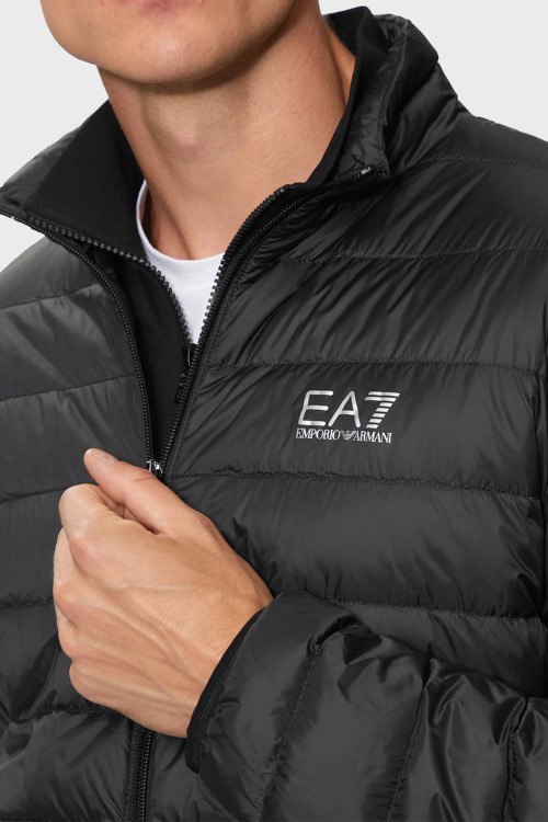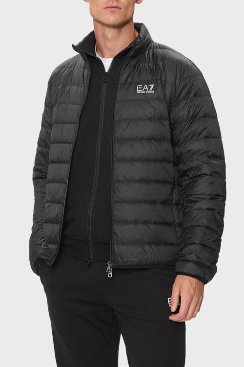 Детали: Мужская черная куртка на пуху от EA7 Emporio Armani (ЕА7 Эмпорио Армани). Стеганый дизайн, высокий воротник, логотип на груди, боковые карманы на молнии, застежка-молния, классическая длина, наполнитель из микса пуха и пера