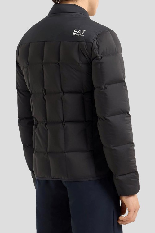 Детали: Мужская черная куртка на пуху от EA7 Emporio Armani (ЕА7 Эмпорио Армани). Стеганый дизайн, логотип на плече, воротник-стойка со скрытым капюшоном, боковые карманы на молнии, застежка-молния, классическая длина, наполнитель из микса пуха и пера