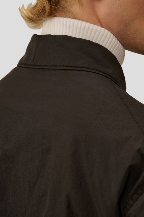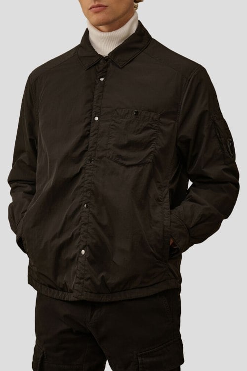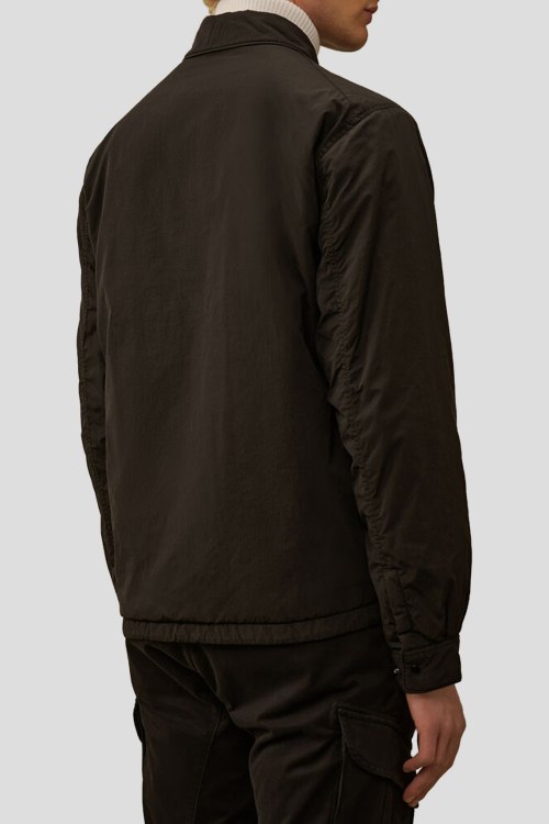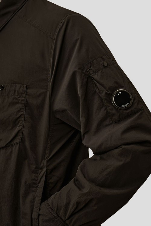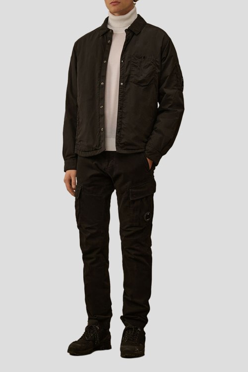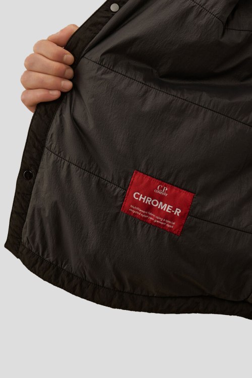 Детали: Мужская черная утепленная куртка из ткани Chrome-R от C.P. Company (СиПи Компани). Модель из 100% переработанного многониточного нейлона с блеском, изготовленного из производственных остатков и сертифицированного по стандарту Global Recycled Standard. Отложной воротник, три кармана, застежка на пуговицы, классическая длина