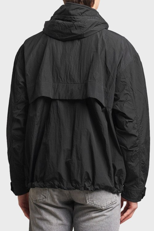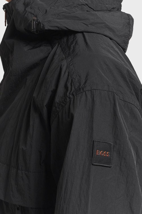 Мужская черная куртка Obosco-W из полиамида от Hugo Boss (Хуго Босс). Классическая длина, вшитый капюшон, застежка на молнию, патч-лого, прорезные карманы на молнии, один внутренний карман, утяжка по низу изделия