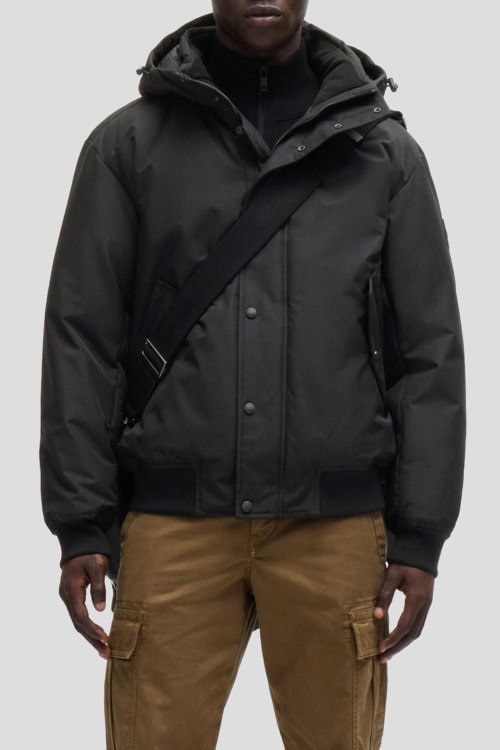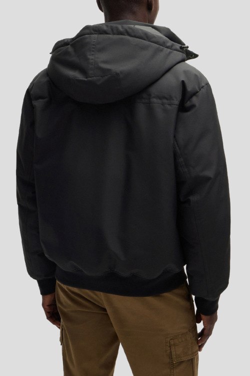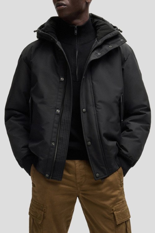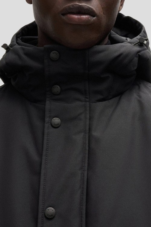 Мужская черная куртка из полиэстера от Hugo Boss (Хуго Босс). Высокий воротник-стойка, застежка на молнию и кнопки, вшитый капюшон, флисовая подкладка, утепленная модель синтепоном, патч-лого