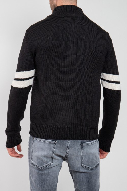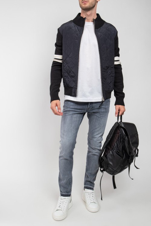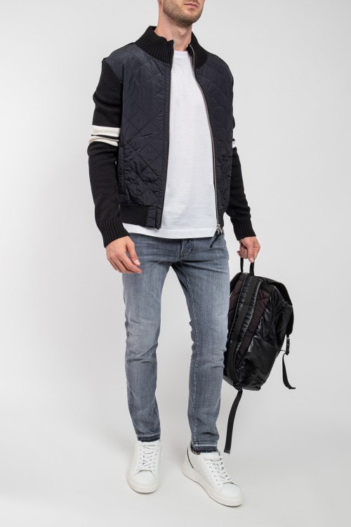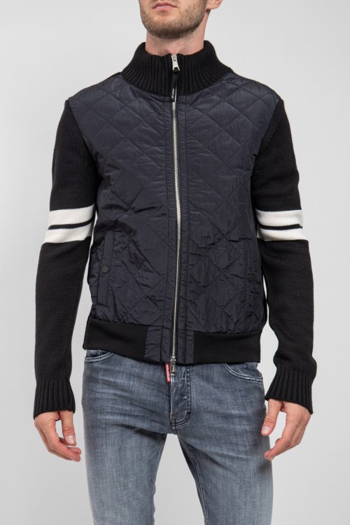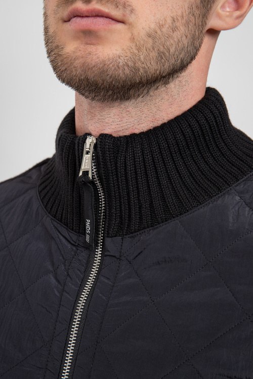 Мужская черная куртка из шерстяного микса от PMDS (ПиЭмДиСи). Комбинированный дизайн, стеганая вставка спереди, высокий воротник-стойка, застежка на молнию, длинные рукава, трикотажная резинка на манжетах и по низу изделия, прорезные карманы на кнопку, контрастные вставки.